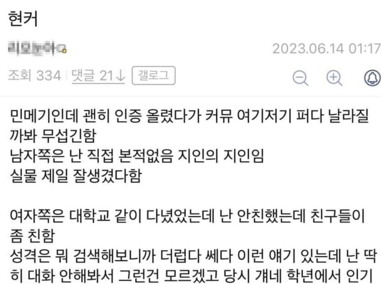 실물 제일 잘생겼다고 한다"라고 말하며 "여자 쪽은 대학교 같이 다녔는데 난 안친했는데 친구들이 좀 친하다. 성격은 검색해보니까 더럽고, 쎄다 이런 얘기가 있는데 나는 딱히 대화 안해봐서 모르겠다. 당시 걔네 학년에서 인기 많았다. 현커인 이야기 들었다"라고 설명했습니다.